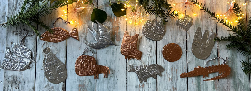 Join artist Clare Youngs for a festive workshop learning the fascinating craft of tin embossing. Taking inspiration from folk art designs and patterns, Clare will show you how to use an embossing tool on the foil with templates provided, or from ones that you create yourself. Participants will go home with beautiful decorations to display, hang on the tree or to turn into unique greetings cards.